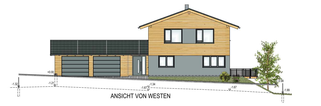 Das Gebäude ist errichtet in Holzmassivbauweise mit Einliegerwohnung und Doppelgarage.